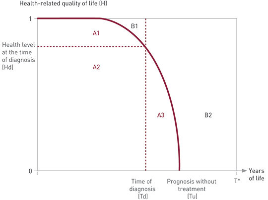 The second definition assesses the degree of severity on the basis of remaining life expectancy in the absence of treatment (Tu – Td), and can also be justified in terms of the patient’s acute need for help (rule-of-rescue). According to this definition, a short remaining life expectancy is deemed more serious than when the prognosis is longer. British health authorities emphasise such «end-of-life» assessments (10). Both of these first definitions have only one dimension of health and are therefore overly simplistic. For example, 1 – Hd ignores prognosis in relation to survival, while Tu – Td ignores acute need for pain relief.