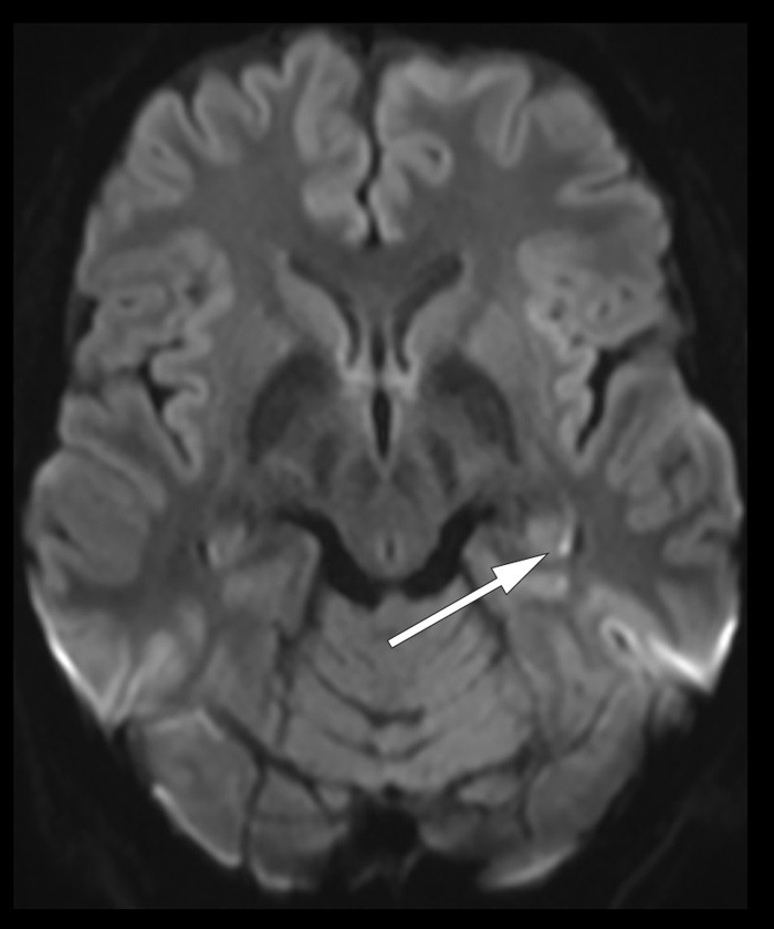 Clinical examination in the accident and emergency department revealed no current neurological deficits, beyond anterograde amnesia, and CT of the head was unremarkable. Further examination two days later showed a normal EEG with no signs of epileptic activity. Diffusion-weighted MRI of the brain revealed a 2 mm wide diffusion lesion in the left caudal hippocampus (arrow). Such subtle diffusion abnormalities in the hippocampus are typical of transient global amnesia (TGA) (1) .