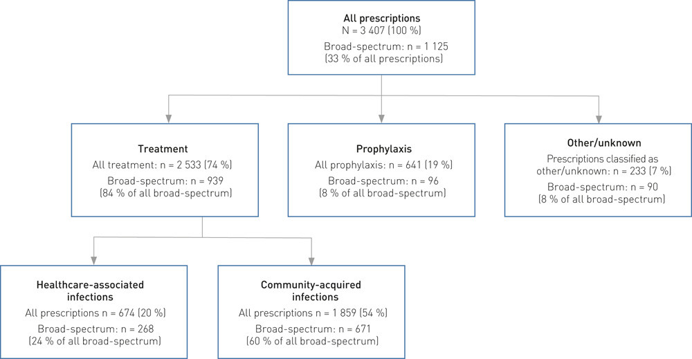 Broad-spectrum antibiotics accounted for 33 % of all prescriptions of antibiotic drugs (Figure 1). Out of 1 125 prescriptions of broad-spectrum drugs, 939 (84 %) were administered as treatment and 96 (8 %) as prophylaxis, whereas 90 (8 %) were classified as unknown/other (Figure 1). Of the broad-spectrum antibiotics, piperacillin with an enzyme inhibitor and third-generation cephalosporins were most frequently prescribed, in total accounting for 23 % of all prescriptions.