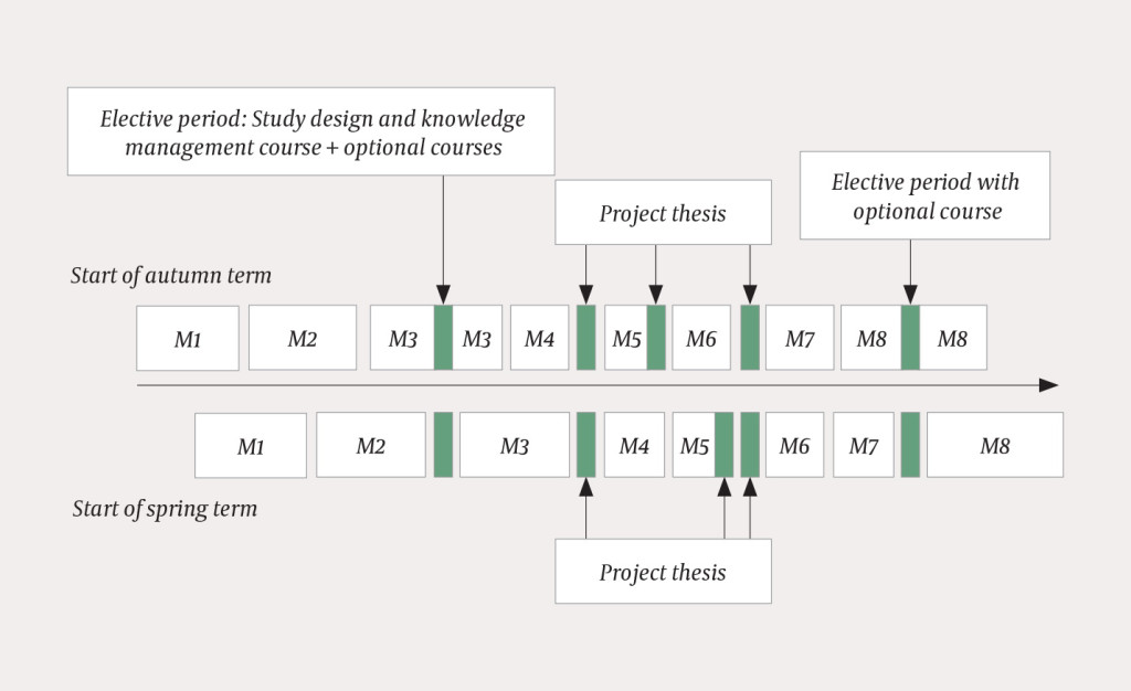 I planleggingen av studiet ved UiT ble elleve uker avsatt til valgfrie perioder og 12 uker til obligatorisk oppgave (2). Studentene sto fritt til å bestemme innholdet. De kunne velge katalogtilbud eller selv legge opp en plan. Opplegget måtte godkjennes av Råd for valgfri undervisning (i dag Komite for vitenskapelig kompetanse). Det har også vært enkelte tilbud om valgfrie emner og kurs. I den siste revisjonen ved UiT er det totalt 22 valgfrie uker (4). Fire uker er avsatt til utforming av protokoll for oppgaven, og 14 uker til selve prosjektoppgaven eller masteroppgaven (4).