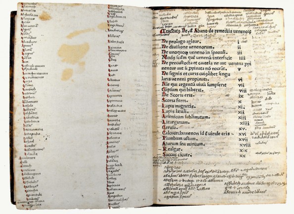 Petrus de Abano (1257–1316) was an Italian philosopher and professor of medicine. In his book De venenis, which is based on Arabic sources and deals with matters such as poisons, the listed medical conditions and medicinal plants are meticulously arranged in columns, with associated comments and annotations. Robert MacLean argues that these texts were written for posterity, in the panicked ambition of the time to preserve 'everything'. Therefore, the added notes were also categorised and arranged with initial capitals marked in red to arrange the information for later generations. Illustration: Petri de Abano. De venenis. Rome: Georgius Sachsel and Bartholomaeus Golsch, approx. 1475. Reprinted with permission from the University of Glasgow Library, Special Collections.