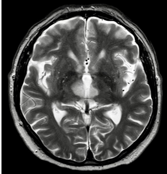 Our patient was a man in his late sixties who abruptly lost consciousness while on holiday abroad. He was quickly collected by ambulance and driven to the nearest hospital. Thrombolytic therapy was not initiated because the cause of his loss of consciousness was unclear. He was intubated on arrival and the left pupil was observed to be more dilated than the right one. CT head and CT angiography performed on the day of admission yielded no relevant pathological findings. Head MRI on day 4 of the hospitalisation showed infarcts bilaterally in the medial thalamus (image on right).