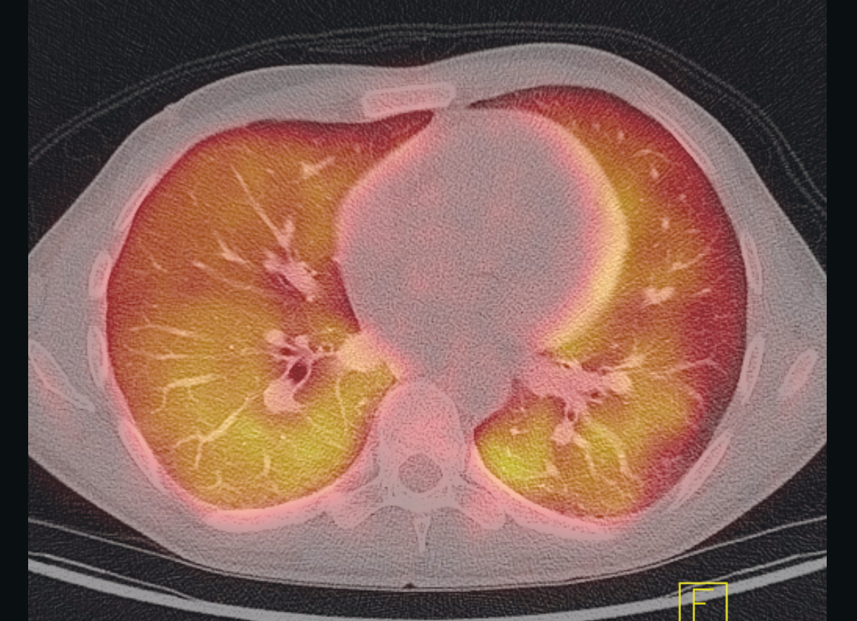 In the days that followed, the patient continued to have episodes of fever and increasing dyspnoea, as well as reduced general condition. PET-CT scan was performed, which showed signs of widespread, diffuse uptake of ¹⁸F-fluorodeoxyglucose (¹⁸F-FDG) in both lungs, as well as reactive spleen and bone marrow (Figure 1).