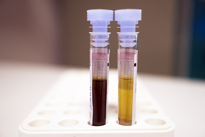 The picture shows tubes with brown and normal-coloured serum. The brown sample was taken from a man in his thirties who was admitted with infection and graft failure after an allogeneic haematopoietic stem cell transplantation for acute myelogenous leukaemia.