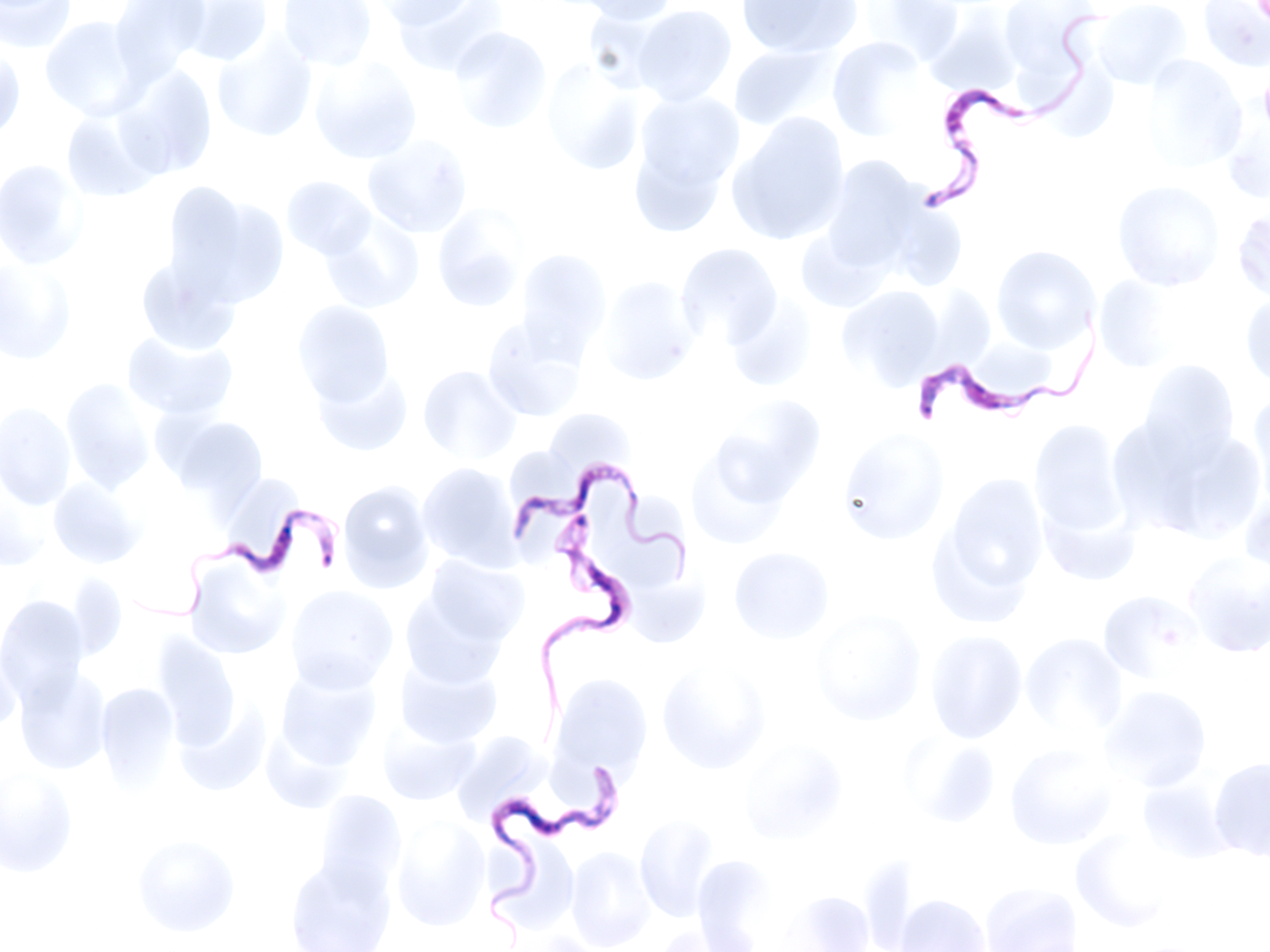 Trypanosoma brucei is the cause of African sleeping sickness, also known as human African trypanosomiasis. T. brucei are elongated protozoa, 13–33 µm long, that move with an undulating motion aided by a flagellum attached to the cell membrane (3). It is not possible to distinguish between the subspecies Trypanosoma brucei gambiense (found in Central and West Africa) and T.b. rhodesiense (found in East Africa) by microscopy.