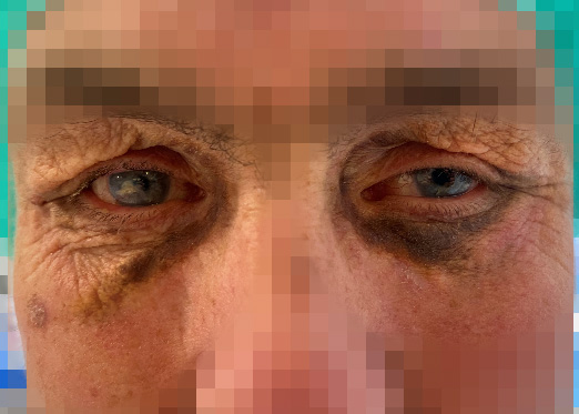 A man in his fifties had previously been treated for recurrent bilateral iridocyclitis and scleritis with 17.5 mg of daily prednisolone tablets and 20 mg of weekly methotrexate injections. Four years prior to the current presentation, he was diagnosed with chronic lymphocytic leukaemia/small lymphocytic lymphoma after the incidental discovery of an enlarged lymph node in his neck. One year before the current presentation, a skin biopsy of recently developed pigmented plaques under his eyes revealed findings consistent with necrobiotic xanthogranuloma (Figure 1).
