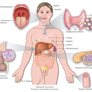 Sykdommer som har sitt opphav i andre organer, kan komme til uttrykk i huden. Dette gjelder bl.a. endokrine sykdommer som Addisons sykdom, Cushings syndrom, hypotyreose og diabetes. Generalisert kløe er ikke uvanlig ved uremi og gallestase. Jernmangel kan ligge bak hårtap, og malabsorpsjon av sink gir en karakteristisk hudsykdom hos spedbarn. Palmart erytem og spider nævi kan opptre ved leversykdom, og enkelte hudsykdommer er assosiert med tarmsykdom, slik som dermatitis herpetiformis (cøliaki) og pyoderma gangrenosum (ulcerøs kolitt) (1). Også intern malign sykdom kan komme til uttrykk...