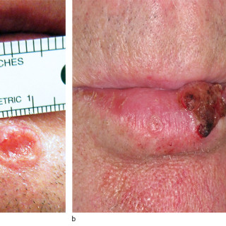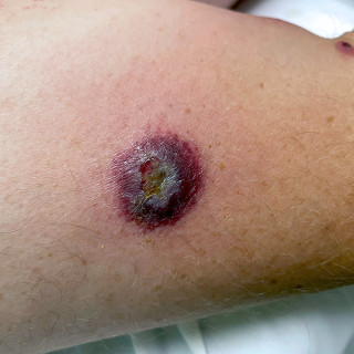 Bildet viser leukemiske hudinfiltrasjoner hos en mann i 50-årene diagnostisert med akutt myelogen leukemi. Pasienten ble overført fra lokalsykehus til hematologisk avdeling ved universitetssykehus, der han ble innlagt med spørsmål om alvorlig infeksjon. Han hadde da 14 dagers sykehistorie med tiltakende luftveissymptomer, økende dyspné og fallerende allmenntilstand. De siste fire dagene var det også tilkommet flere flekkvise, nodulære hudlesjoner, mest uttalt på hals, bryst og overekstremiteter. Blodprøver ved ankomst universitetssykehuset viste hemoglobin 8,1 g/dL (referanseområde 13,4–17,0)...